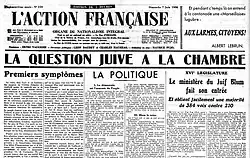 L'arrivée au pouvoir de Léon Blum déclenche les foudres de l'extrême droite parlementaire et des ligues qui lui sont affiliées[11], suscitant une recrudescence de l'antisémitisme[4]. S'il était porté, à la Belle Époque, par des députés marginaux, il bénéficie désormais d'une réelle écoute, notamment à travers la parole du vice-président du groupe parlementaire de la Fédération républicaine, Xavier Vallat[4]. À l'arrivée de Blum, celui-ci déclare à la tribune : « Pour la première fois, ce vieux pays gallo-romain sera gouverné par un Juif »[6].