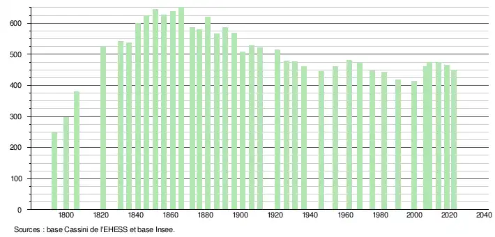 L'évolution du nombre d'habitants est connue à travers les recensements de la population effectués dans la commune depuis 1793. Pour les communes de moins de 10 000 habitants, une enquête de recensement portant sur toute la population est réalisée tous les cinq ans, les populations de référence des années intermédiaires étant quant à elles estimées par interpolation ou extrapolation[22]. Pour la commune, le premier recensement exhaustif entrant dans le cadre du nouveau dispositif a été réalisé en 2008[23].