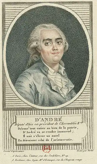 Antoine-Balthasar-Joseph d'André[2] (1759-1825) est un homme politique, conseiller au Parlement de Provence puis député de l'Assemblée constituante de 1789. Né à Aix-en-Provence, le , il est mort à Paris (10e ancien), le .