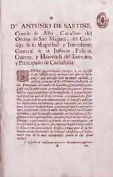 Antonio de Sartine est surtout connu comme l'architecte de l'ordenanza, l'édit portant son nom : datant du , celui-ci réforma profondément le cadastre en Catalogne. Cet édit permit de mettre à jour les registres cadastraux, de systématiser l'impôt sur les terres, de clarifier la soumission à l'impôt des membres du clergé et les mécanismes de l'impôt lui-même, donnant au système une fiabilité nouvelle.