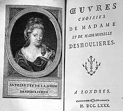 Antoinette de Lafon de Boisguérin des Houlières ou Deshoulières, née Antoinette du Ligier de la Garde le à Paris et morte le dans la même ville, est une femme de lettres française et membre de l’Académie des Ricovrati, elle fréquente le salon de Mademoiselle de Scudéry.