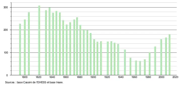 - ↑ Par convention dans Wikipédia, le principe a été retenu de n’afficher dans le tableau des recensements et le graphique, pour les populations légales postérieures à 1999, que les populations correspondant à une enquête exhaustive de recensement pour les communes de moins de 10 000 habitants, et que les populations des années 2006, 2011, 2016, etc. pour les communes de plus de 10 000 habitants, ainsi que la dernière population légale publiée par l’Insee pour l'ensemble des communes.