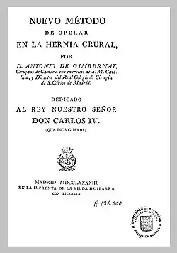 - (es) Nuevo Método de operar en la Hernia Crural. Gimbernat A. Madrid, Ibarra, 1793.