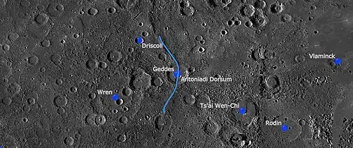 Image Mariner 10 Antoniadi Dorsum reliant deux cratères non nommés, et coupant le cratère Geddes