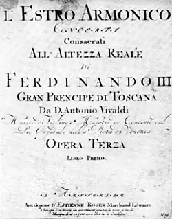 Son opus 3, recueil de douze concertos pour instruments à cordes intitulé L'estro armonico, sortit des presses d’Estienne Roger en 1711. Il était dédié à l’héritier du Grand-duché de Toscane, Ferdinand de Medicis, prince de Florence (1663-1713), et marqua une date capitale dans l’histoire de la musique européenne : de cet ouvrage date en effet la transition entre le concerto grosso et le concerto de soliste moderne.