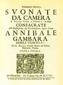 Puisque Vivaldi avait été chargé d’enseigner la composition des concertos aux jeunes filles de la Pietà en 1705, il faut supposer qu’il avait déjà, à cette époque, une solide réputation de compositeur. Ses œuvres avaient déjà circulé sous la forme de copies manuscrites, pratique courante à cette époque, quand il décida, en 1705, de faire imprimer son Opus I (douze Sonates en trio, op. 1, conclues par son œuvre La Follia, la plus connue) par l’éditeur de musique le plus connu de Venise, Giuseppe Sala.