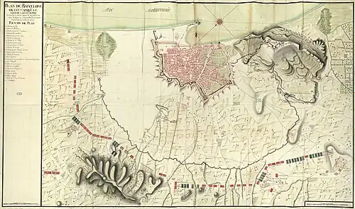 En , le duc de Popoli est relevé et remplacé par le duc de Berwick venu de France avec 15 bataillons dont 10 de vétérans en renforcement du corps expéditionnaire français. Le duc de Berwick ordonne aux ingénieurs français de créer les tranchées d’attaque face aux défenses de la ville. Il lance l’assaut contre Barcelone le mais Villarroel réussit à expulser les troupes bourboniennes de la ville le .
