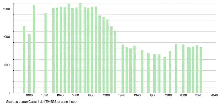 L'évolution du nombre d'habitants est connue à travers les recensements de la population effectués dans la commune depuis 1793. Pour les communes de moins de 10 000 habitants, une enquête de recensement portant sur toute la population est réalisée tous les cinq ans, les populations de référence des années intermédiaires étant quant à elles estimées par interpolation ou extrapolation[16]. Pour la commune, le premier recensement exhaustif entrant dans le cadre du nouveau dispositif a été réalisé en 2007[17].