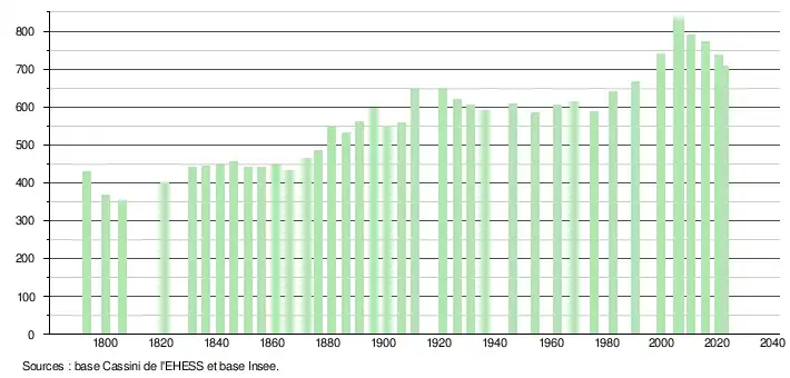 L'évolution du nombre d'habitants est connue à travers les recensements de la population effectués dans la commune depuis 1793. Pour les communes de moins de 10 000 habitants, une enquête de recensement portant sur toute la population est réalisée tous les cinq ans, les populations de référence des années intermédiaires étant quant à elles estimées par interpolation ou extrapolation[38]. Pour la commune, le premier recensement exhaustif entrant dans le cadre du nouveau dispositif a été réalisé en 2005[39].