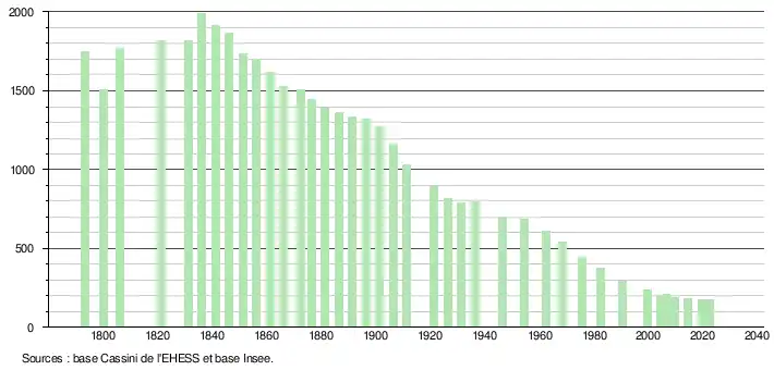 L'évolution du nombre d'habitants est connue à travers les recensements de la population effectués dans la commune depuis 1793. Pour les communes de moins de 10 000 habitants, une enquête de recensement portant sur toute la population est réalisée tous les cinq ans, les populations de référence des années intermédiaires étant quant à elles estimées par interpolation ou extrapolation[20]. Pour la commune, le premier recensement exhaustif entrant dans le cadre du nouveau dispositif a été réalisé en 2004[21].