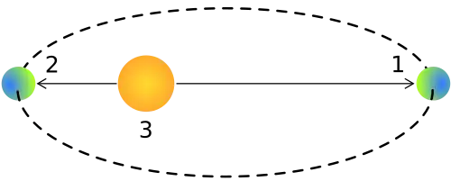 - ↑ L'objet orbite autour du centre de masse, c'est-à-dire le barycentre de l'ensemble des objets du système considéré. Ce barycentre peut se trouver à l'intérieur de l'étoile centrale lorsque sa masse constitue la plus grande partie de celle du système.