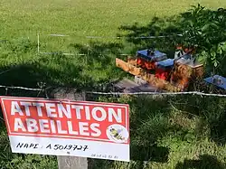 Panneau réglementaire devant se trouver à proximité du rucher, et indiquant le NAPI (N° APIculteur déclaré auprès de la Direction générale de l’Alimentation ou DGAL).