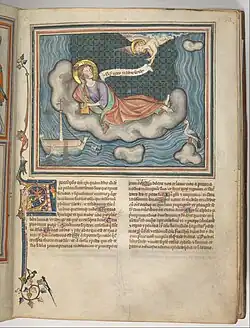 Le manuscrit est décoré de 72 miniatures qui s'inspirent elles-aussi d'un modèle proche de l'apocalypse de Lambeth. Il possède l'originalité de contenir un cycle de la vie du Christ en préface (f.1-2) ainsi qu'une miniature de dédicace représentant les commanditaires en fin d'ouvrage (f.38v.). Ses miniatures, contrairement aux modèles anglais de cette époque, représentent des scènes beaucoup plus apaisées et insistent beaucoup moins sur l'aspect terrible du récit, avec des personnages élégants voire maniérés[15].