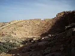 Le théâtre est situé à l'extérieur de l'enceinte, adossé au rempart et à la colline de l'acropole. La Cavea de vingt-huit gradins est en partie creusée dans la roche, en partie construite. Le bâtiment date de la période hellénistique, avec un orchestra circulaire de 13 mètres de diamètre, modifié en demi-circulaire par l'édification d'une scène de 20 mètres[56]. D'après les indications d'une inscription latine dédicatoire, il a été transformé sous Domitien dans les années 92-96. par un décor de colonnes, la suppression de deux gradins inférieurs remplacés par un haut parapet entre la cavea et l'orchestre[57]. Cette séparation de protection entre la cavea et l'orchestre laisse supposer une transformation pour des jeux de gladiature ou des chasses[56].