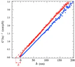 S'il n'y a pas de glissement, l'inverse de la partie imaginaire de la fonction réponse varie linéairement avec h et la courbe = f(h) est une droite passant par l'origine. Si un glissement est présent, est une courbe qui tend vers 0 lorsque h tend vers b et qui tend vers une droite dont la position dépend de b pour h>>b (figure ci-contre).