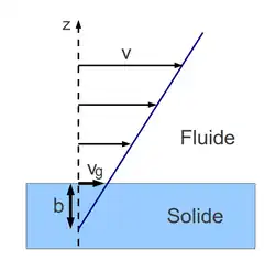 Il est possible de caractériser le glissement à la surface par deux grandeurs: la vitesse de glissement et la longueur de glissement. La vitesse de glissement représente la vitesse tangentielle du fluide à la paroi solide. La longueur de glissement est obtenue par extrapolation du profil de vitesse jusqu'au point où la vitesse s'annule (figure ci-contre).