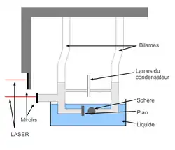 La mesure du déplacement relatif entre la sphère et le plan se fait à l'aide d'un capteur capacitif. L'expérimentateur mesure la capacité entre les deux armatures d'un condensateur liées respectivement à la sphère et au plan. Les deux armatures sont des disques métalliques, ces disques sont percés afin de diminuer la dissipation due à l’écoulement d’air, leur parallélisme est assuré mécaniquement grâce à une rotule. Le condensateur plan ainsi formé a une capacité: