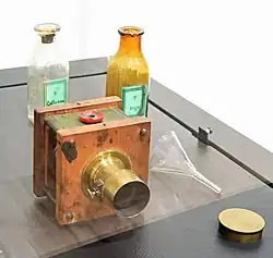1839. Nicéphore Niepce et Louis Daguerre travaillent ensemble à la naissance du Daguerréotype. Daguerre profitant de la lassitude de son associé vieillissant parvient à gommer presque toute trace de lui et le nouveau procédé ne sera associé qu'à son nom. L’État français accorde néanmoins, outre une rente annuelle de 6000 francs à Daguerre une rente de 4000 francs à Isidore, le fils de Niepce en paiement de l'achat par la France du procédé qui est placé dans le domaine public et librement utilisable[4]. La maison Giroud (le beau-frère de Daguerre) de Paris sera chargée de la production en série de chambres à tiroir en bois[1],[2],[3],[5].
