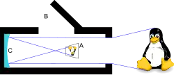 Une image du sujet est visible sur une plaque (A), par l'interstice (B) creusé à même la chambre, grâce à un miroir concave (C), poli, qui concentrait les rayons. Une fois l'image correctement cadrée, l'opérateur remplaçait l'écran par une plaque sensible à la lumière, pendant environ 90 secondes. La photo était prise.