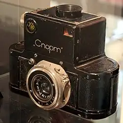1936. L'autre prétendant au titre de premier reflex 35 mm. Les diverses annonces dans la presse russe laissent penser que sa sortie est postérieure à celle du Kiné Exakta[2],[5],[10],[18].