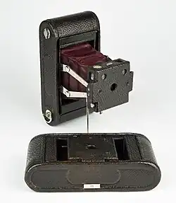 1897. Kodak lance une famille d'appareils pliants utilisant des films en bobine qui connaitra un grand succès. La première version est du type "pliant à tendeurs" avec le support d'objectif maintenu en place par quatre compas. Il évoluera en 1905 avec le "Pocket automatic" qui, bien que conservant les quatre compas, sera muni d'un abattant relié au porte objectif par deux biellettes qui permettent le déploiement automatique du soufflet lors de l'ouverture de l'abattant[1],[2],[3],[4],[9].