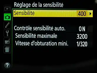 Outre le libre choix de la sensibilité ISO dans la gamme offerte par son appareil, l'utilisateur dispose aussi d'un réglage automatique, plus ou moins élaboré. Dans sa version la plus simple, ce mode augmente la sensibilité ISO lorsque la lumière est insuffisante pour permettre des prises de vue sans bougé. Dans les versions les plus élaborées, l'utilisateur peut définir des stratégies complexes avec choix d'une plage de variation, vitesse d'obturation minimale, prise en compte de la focale utilisée, etc.[34]. Il existe, suivant les modèles et le niveau de gamme, différents échelons entre ces extrêmes. Certains choix dans le traitement d'image peuvent interférer avec le réglage de sensibilité ISO en interdisant l'accès à certaines valeurs car, pour la mise en œuvre de certaines corrections ou compensations, l'appareil augmente la sensibilité.