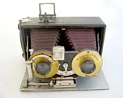 Les premiers appareils photographiques stéréo ont été construits en 1849[1]. L'appareil stéréoscopique des pionniers de la photographie est fabriqué par des ébénistes, tout comme les appareils « normaux ». Un même corps en bois noble, soigneusement construit, rassemble les deux chambres séparées par une cloison verticale médiane. Il appartient à l’usager de choisir ses objectifs chez l’opticien de son choix. Ces appareils sont rarement construits en série, et correspondent plutôt à des commandes individuelles de photographes de métier, selon l’usage qu’ils veulent en faire. Il n’est pas question, à cette époque, de photographie d’amateur : le photographe, stéréoscopiste ou non, doit préparer sur place son émulsion photographique, qu’il étale convenablement sur des plaques de verre appropriées au format de son appareil. Ces formats sont peu standardisés, ou pas du tout, mais la largeur de chaque élément du couple se situe autour de huit centimètres, ce qui procure une sensation de relief assez prononcée, dont la clientèle des cartes stéréoscopiques alors très en vogue en Europe et en Amérique ne se plaint généralement pas. Une construction typique de cette époque est un corps en ébénisterie avec un tiroir de mise au point à crémaillère, qui porte les deux objectifs à monture en laiton, pourvus de diaphragmes parfois couplés par une biellette commune. Les bouchons jouent le rôle d’obturateur. Un bouchon double à charnière horizontale garantit un temps de pose égal des deux côtés.