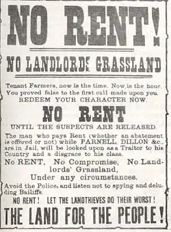 - ↑ Quelques décennies plus tôt, entre 1845 et 1852, s'est déroulée la grande Famine en Irlande qui a contraint des millions d'Irlandais à quitter leur pays, et acculé les autres à la misère et à la famine. Dans les années 1870, la situation économique des populations paysannes irlandaises était toujours très mauvaise.