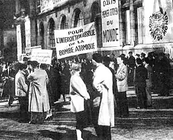 Cette dénonciation prend une dimension exceptionnelle lorsque le Comité du Congrès mondial des partisans de la paix (réuni à Stockholm) lance, le , « l'appel de Stockholm » qui exige notamment « l'interdiction absolue de l'arme atomique »[4].