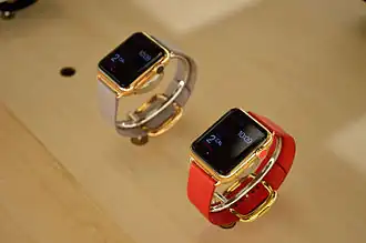 Une gamme "Apple Watch Hermès" apparait en septembre 2015. Il s'agit d'un boîtier en acier inoxydable avec gravure Hermès au dos[20].