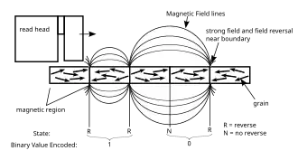 La tête de lecture la plus basique est une tête inductive constituée d’un électroaimant. Lorsqu’une zone magnétique passe à proximité de l’électroaimant, un courant électrique se forme dans le bobinage. Suivant la succession des régions magnétiques, le champ créé est plus ou moins intense, tout comme le courant induit (voir schéma ci-contre).