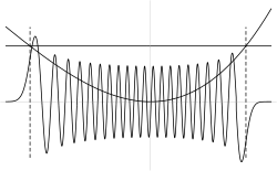 - Dans la région classiquement interdite la probabilité de présence sera exponentiellement décroissante en . En effet, là où , on a alors et le terme exponentiellement croissant sera en général divergent et donc non physique. La normalisation de la fonction d'onde impose alors .