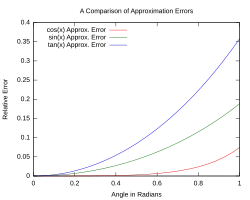 Le développement de Maclaurin (le développement de Taylor autour de 0) de la fonction sinus est[5]où θ est l'angle en radians. De manière plus claire,Le deuxième terme le plus significatif (de troisième ordre) se décompose en cube du premier terme; ainsi, même pour un angle tel que 0,01, la valeur du deuxième terme le plus significatif est de l'ordre de 0,000 001, ou110 000 du premier terme. On peut ainsi approximer sans problème :Alors, puisque le cosinus d'un petit angle est très proche de 1, et que la tangente est donnée par le sinus divisé par le cosinus,