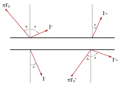 Le flux est séparé en deux composantes, l'une descendante ou transmise et l'autre montante ou réfléchie[8]. En notant μ l'angle d'incidence des rayons parallèles sur la couche considérée, μ0 l'angle zénithal et πF0 la valeur du flux par unité de surface perpendiculairement au rayon incidence, les deux flux sont définis de la façon suivante[9]:Lorsque la couche est éclairée par en-dessous, les flux réfléchis et transmis correspondants sont notés de la façon suivante :