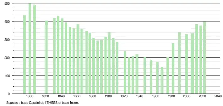 L'évolution du nombre d'habitants est connue à travers les recensements de la population effectués dans la commune depuis 1793. Pour les communes de moins de 10 000 habitants, une enquête de recensement portant sur toute la population est réalisée tous les cinq ans, les populations de référence des années intermédiaires étant quant à elles estimées par interpolation ou extrapolation[19]. Pour la commune, le premier recensement exhaustif entrant dans le cadre du nouveau dispositif a été réalisé en 2007[20].