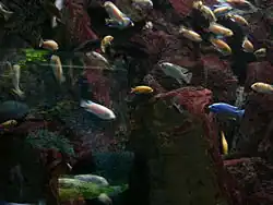 Un aquarium de cichlidés africains se compose généralement de variétés de cichlidés du lac Tanganyika ou du lac Malawi, et nécessite généralement un grand nombre de roches combinées à un substrat de gravier fin ou de sable. L'environnement rocheux doit offrir de nombreuses grottes et cachettes. Parce que les cichlidés, comme les poissons rouges, perturbent le substrat en creusant, les plantes en plastique devraient être utilisées comme substitut aux plantes vivantes. Cependant, de vraies plantes comme Vallisneria ou Anubias peuvent être essayées dans un réservoir de cichlidés[2].