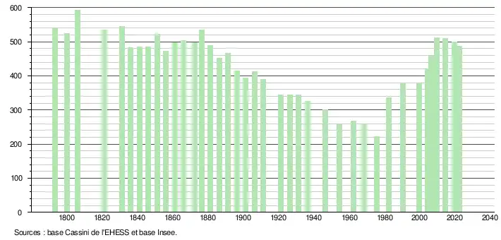 L'évolution du nombre d'habitants est connue à travers les recensements de la population effectués dans la commune depuis 1793. Pour les communes de moins de 10 000 habitants, une enquête de recensement portant sur toute la population est réalisée tous les cinq ans, les populations de référence des années intermédiaires étant quant à elles estimées par interpolation ou extrapolation[20]. Pour la commune, le premier recensement exhaustif entrant dans le cadre du nouveau dispositif a été réalisé en 2004[21].
