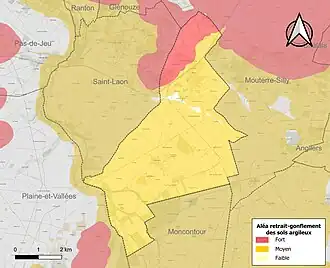 Les mouvements de terrains susceptibles de se produire sur la commune sont des tassements différentiels[20]. Le retrait-gonflement des sols argileux est susceptible d'engendrer des dommages importants aux bâtiments en cas d’alternance de périodes de sécheresse et de pluie[21]. 99 % de la superficie communale est en aléa moyen ou fort (79,5 % au niveau départemental et 48,5 % au niveau national)[Carte 2]. Depuis le , en application de la loi ÉLAN, différentes contraintes s'imposent aux vendeurs, maîtres d'ouvrages ou constructeurs de biens situés dans une zone classée en aléa moyen ou fort[Note 2],[22].
