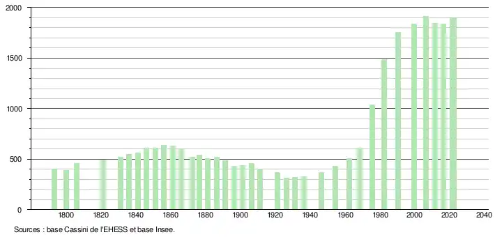 L'évolution du nombre d'habitants est connue à travers les recensements de la population effectués dans la commune depuis 1793. Pour les communes de moins de 10 000 habitants, une enquête de recensement portant sur toute la population est réalisée tous les cinq ans, les populations de référence des années intermédiaires étant quant à elles estimées par interpolation ou extrapolation[19]. Pour la commune, le premier recensement exhaustif entrant dans le cadre du nouveau dispositif a été réalisé en 2006[20].