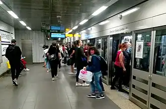 La station est souterraine, sur trois niveaux[9] : au premier niveau se trouvent les quais, le deuxième, niveau intermédiaire, permet la desserte des deux quais[10] et le troisième niveau possède la salle des billets et les accès. Elle possède deux accès, situés côté sud, par différents escaliers, tunnels ou ascenseurs. Les quais comptent douze portes, ce qui leur permet d'accueillir des rames doubles, de quatre voitures, mesurant 52 m.