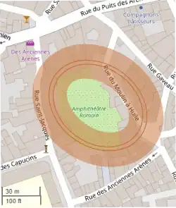Pour faciliter la circulation des spectateurs, une galerie annulaire large de 3,78 m fait le tour de la cavea au rez-de chaussée, à mi-distance de l'arène et de la façade. L'arène, pour sa part, est séparée des premiers rangs de gradins par un mur[6]. Par contre, le nombre de gradins et la disposition des accès (vomitoires) restent largement inconnus[9]. Un vomitoire semble toutefois s'ouvrir à chaque extrémité du grand axe de l'amphithéâtre[6].