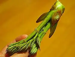 Ces jeunes pousses sont nommés dureup / douleup (두릅) en coréen et la plante qui les fournit 두릅나무, dureup arbre. En japonais, c’est タラの芽 taranome[5] et en chinois 刺老芽 cìlǎoyá[n 4] (ou 龙牙木 lóngyámù morph. « bois de dents de dragon ») qui désignent les jeunes pousses.