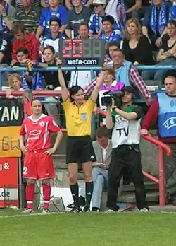 - Arbitre remplaçant (dit quatrième arbitre) : présent dans certaines compétitions nationales et internationales, il se place entre les bancs de touche et a pour mission d'assurer la discipline parmi les remplaçants et leur encadrement. C'est lui aussi qui affiche les remplacements et le temps additionnel (en général au moyen d'un panneau lumineux prévu à cet effet). Le cas échéant, il remplace l'arbitre ou un assistant défaillant.