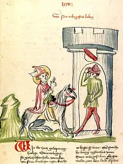 Saint Arbogast entrant à Strasbourg, illustration de La Légende dorée alsacienne (1419)[3].