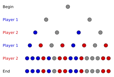 - Colorez le dernier niveau de l'arbre de jeu de sorte que toutes les victoires du joueur 1 soient colorées dans un sens (bleu dans le diagramme), toutes les victoires du joueur 2 soient colorées d'une autre façon (rouge dans le diagramme) et toutes les égalités soient colorées d'une troisième façon (gris sur le diagramme).
