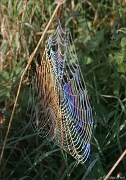 Les arcs-en-ciel de rosée sont assez rares et se produisent surtout à l'automne quand le refroidissement nocturne par ciel dégagé permet d'importants dépôts de rosée. L'arc se forme de la même façon qu'un arc-en-ciel classique. La source de lumière derrière l'observateur éclaire la brume ou le brouillard et la lumière effectue une réfraction en passant de l'air dans les gouttes, suivie d'une diffraction, puis une réflexion interne et une nouvelle réfraction en sortant des gouttes avant d'atteindre l'observateur. Il est surtout visible sur les toiles d'araignées et plus rarement sur les murs ou encore l'herbe[2]. En effet, les gouttes condensées sur les toiles peuvent être assez grosses, et, sont suspendues dans l'air ce qui permet à la lumière de les traverser sans obstacles comme c'est le cas pour les gouttes de pluie.