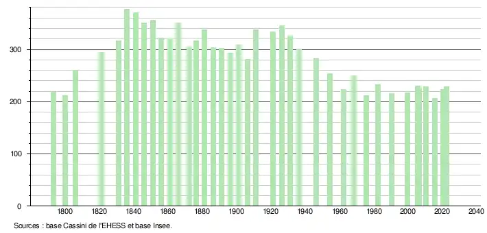 L'évolution du nombre d'habitants est connue à travers les recensements de la population effectués dans la commune depuis 1793. Pour les communes de moins de 10 000 habitants, une enquête de recensement portant sur toute la population est réalisée tous les cinq ans, les populations de référence des années intermédiaires étant quant à elles estimées par interpolation ou extrapolation[14]. Pour la commune, le premier recensement exhaustif entrant dans le cadre du nouveau dispositif a été réalisé en 2005[15].