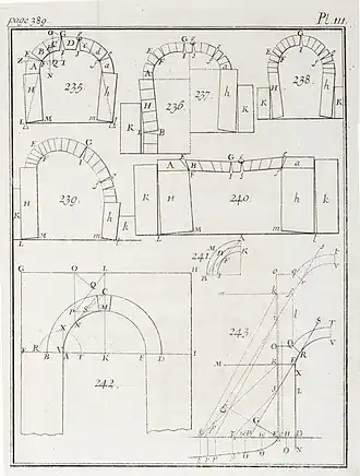 De même, des années plus tard, le mathématicien David Gregory fournit une manière de dimensionner une culée, montrant que si dans la caténaire les forces poussent vers l'intérieur, dans l'arc d'une caténaire inversée, elles le font vers l'extérieur. Le mathématicien français Philippe de La Hire (1640-1718) a une approche différente dans son Traité de mécanique, essayant de trouver quel est le poids approprié des voussoirs pour améliorer la stabilité de l'arcade[21], employant pour la première fois un polygone funiculaire dans la description d'un arc, avec l'hypothèse initiale de non-résistance entre les voussoirs. Plus tard, en l'an 1712, il publie son mémoire sur la Construction des voûtes dans les édifices qui influence les générations postérieures de constructeurs européens comme dans les tables constructives des arcs de ponts élaborés par Jean-Rodolphe Perronet[22]. Ces tables seront populaires dans la construction empirique de ponts européens jusqu'à la moitié du XIXe siècle.