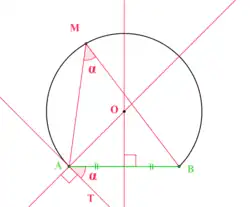 En utilisant un rapporteur et en reportant l'angle α en A, on peut donc construire la tangente au cercle en A. Le centre O du cercle porteur de l'arc capable est situé à l'intersection de la médiatrice de la corde [AB] et de la perpendiculaire en A à la tangente [AT).