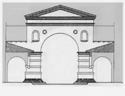 L’ensemble du complexe monumental, probablement pourvu de dômes, surplombait une artère importante allant d’est en ouest de la ville, que croisaient deux passages de moindre importance pourvus de colonnes. L’arc constituait ainsi à la fois une entrée monumentale et un point de transition entre la ville et le palais sacré de l’empereur[1].